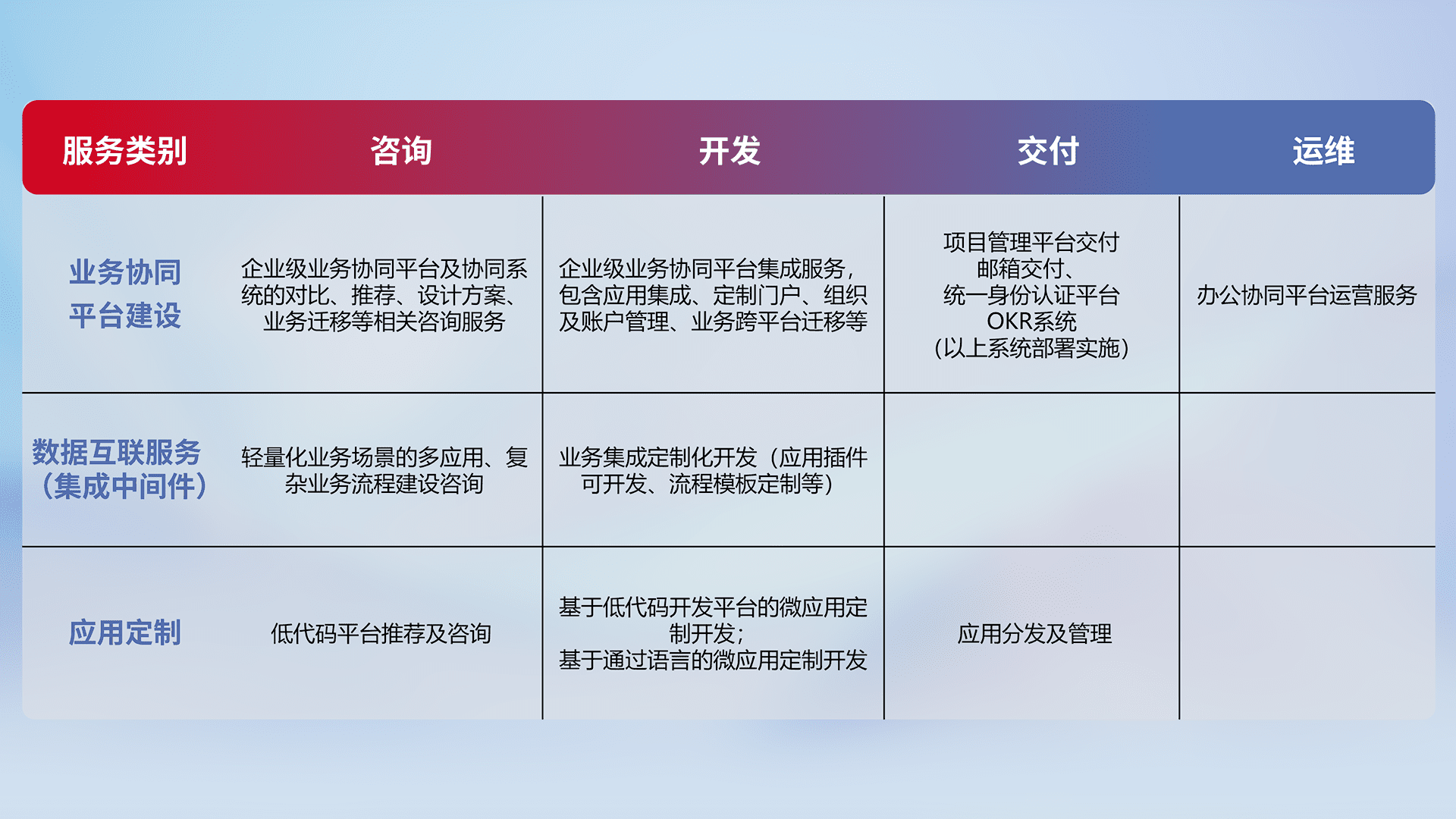 针对钉钉、、、企微、、、IDaas等平台级产品提供产品的规划、、方案、、交付、、定制化开发等服务,,,实现如统一协同办公、、智能客户服务、、混合会议管理、、、、智能数据查询、、、等业务场景,,,,实现数字化转型。。。