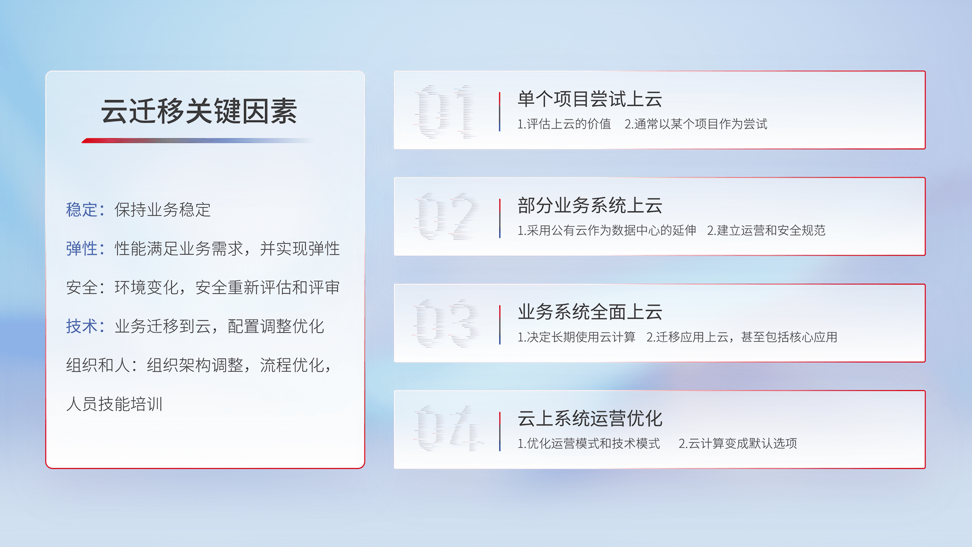 结合实际业务,,,,从规划设计、、、云平台选型、、、、云原生改造、、数据迁移、、、、集成交付,,迁移全过程为客户识别最佳上云路径,,,,做好风险识别管理,,,,设计网络架构、、、、身份权限、、、、安全审计合规、、操作审计、、、日志审计、、监控告警策略、、、多站点容灾设计等,,,,对云上基础设施进行整体规划,,,,提升IT治理水平,,,,以满足弹性、、高可用、、、、高性能的需求。。。。